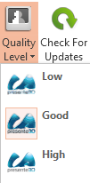 By default quality level is set at Good. It is recommended that you run at this level for most presentation. If you have a small presentation or high powered PC you can run at High resolution.